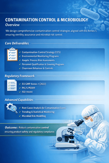 We design comprehensive contamination control strategies aligned with EU Annex 1, ensuring sterility assurance and microbial risk control.